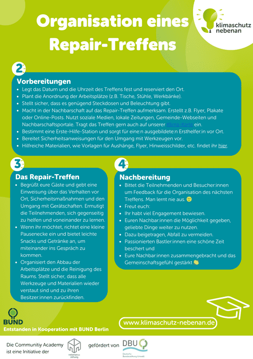 - Freut euch: Ihr habt viel Engagement bewiesen; euren Nachbar:innen die Möglichkeit gegeben, geliebte Dinge weiter zu nutzen; dazu beigetragen, Abfall zu vermeiden; passionierten Bastler:innen eine schöne Zeit beschert und eure Nachbar:innen zusammengebracht und das Gemeinschaftsgefühl gestärkt