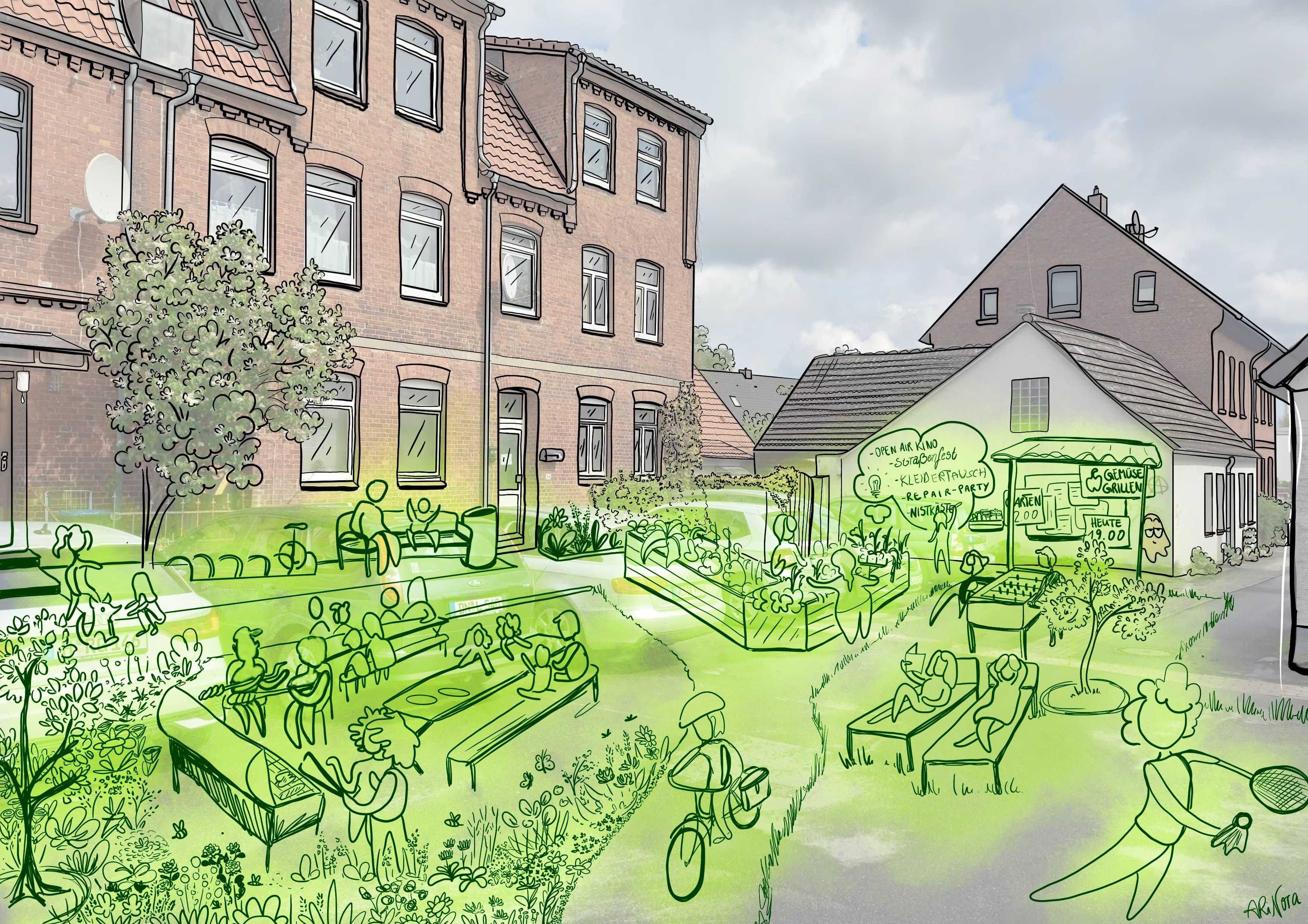 Eine zentrale ca. 50m² große Parkfläche in einer verkehrsberuhigten Straße entsiegeln und durch Begrünung, Hochbeete und Sitzgelegenheiten zu einem Begegnungsort für die Nachbarschaft umzugestalten.