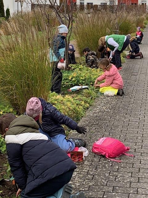 SeniorInnen und SchülerInnen verschönern das Seniorendorf Bargteheide, indem sie in die ungenutzen Rasen und Beetflächen ganz viele Blumenzwiebeln setzen.