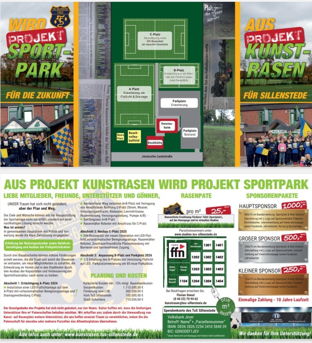2024: Flutlicht B-Platz von Halogen auf LED umrüsten (50% Ersparnis), automat. Beregnungsanlagen (Brunnen) und Rasenmähroboter (Energie Photovoltaik), sowie neues dimmbares/einzeln schaltendes Flutlicht auf dem A-Platz. barrierefreier Weg zwiscehn den beiden Plätzen