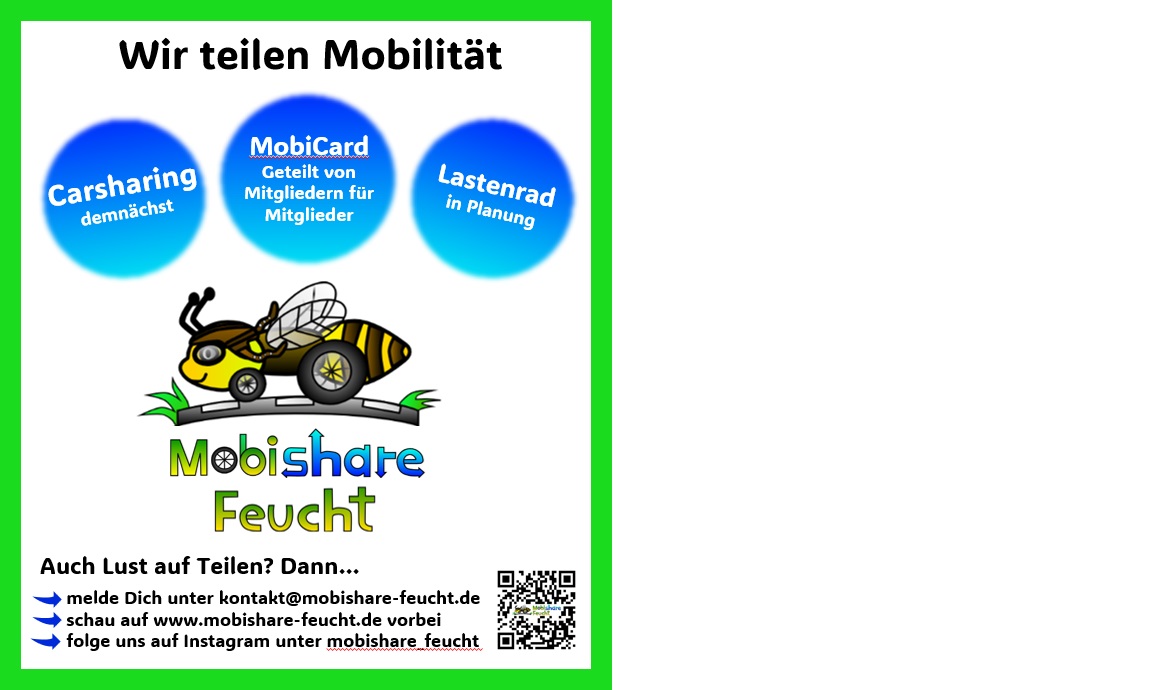 Wir laden alle Nachbarn ein, sich nicht nur die MobiCard auszuleihen, sondern auch bei den anderen Ideen von Mobishare Feucht aktiv mitzumachen: dem Lastenrad für alle, dem Teilen von Gebrauchsgegenständen, dem Aufbau von Carsharing oder der Verbesserung unserer nicht-fossilen Verkehrsinfrastruktur.