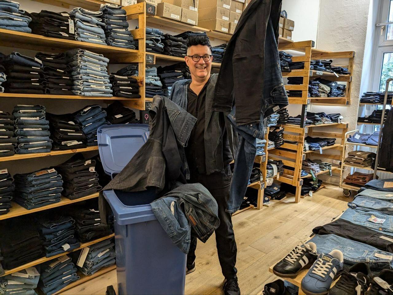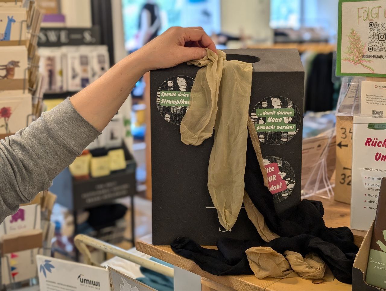In unserem Laden steht bereits eine große blaue Tonne für kaputte Jeans und diverse Kisten an gesammelten alten Jeans, die darauf warten zum Recycler geschickt zu werden. Ebenso steht bei uns im Laden eine Box für kaputte Nylonstrumpfhosen, die ebenfalls gut angenommen wird. Aus diesen wird recyceltes Nylon und daraus werden neue Strumpfhosen produziert.