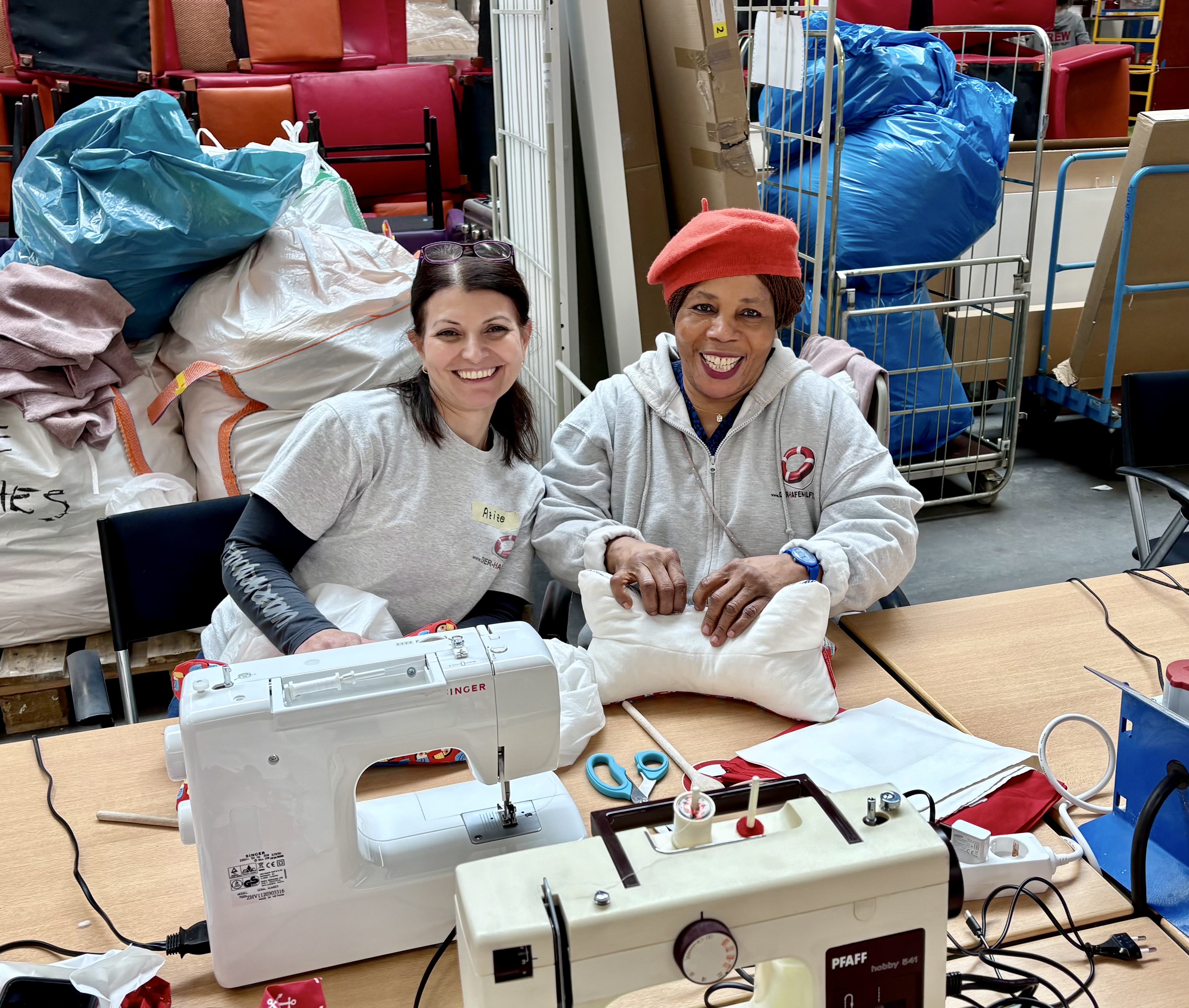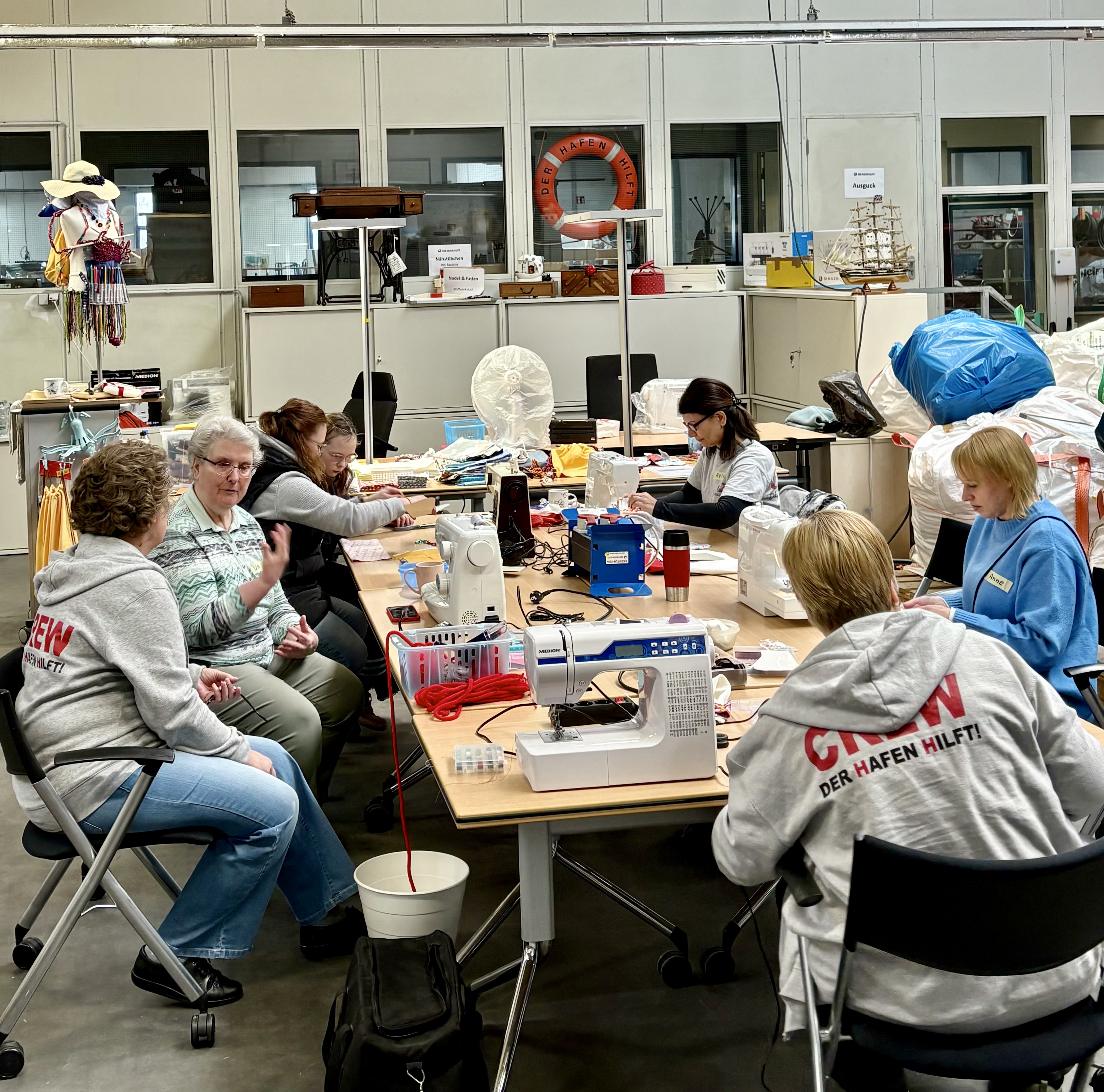 Nadel & Hafen startete 2024 mit gespendeten Kreuzfahrttischdecken. Seither näht eine wachsende Gruppe Ehrenamtlicher regelmäßig im Spendenlager oder zu Hause. Erste Turnbeutel, Stiftemäppchen und Leseknochen gingen an Jugendhilfeeinrichtungen oder in Krisengebiete wie das Ahrtal. Sowohl Stoffe als auch Material stammen aus Spenden. Die Nachfrage nach den fertigen Produkten steigt stetig – und zeigt, wie sinnvoll Weiterverwertung und ehrenamtliches Engagement zusammenwirken können.