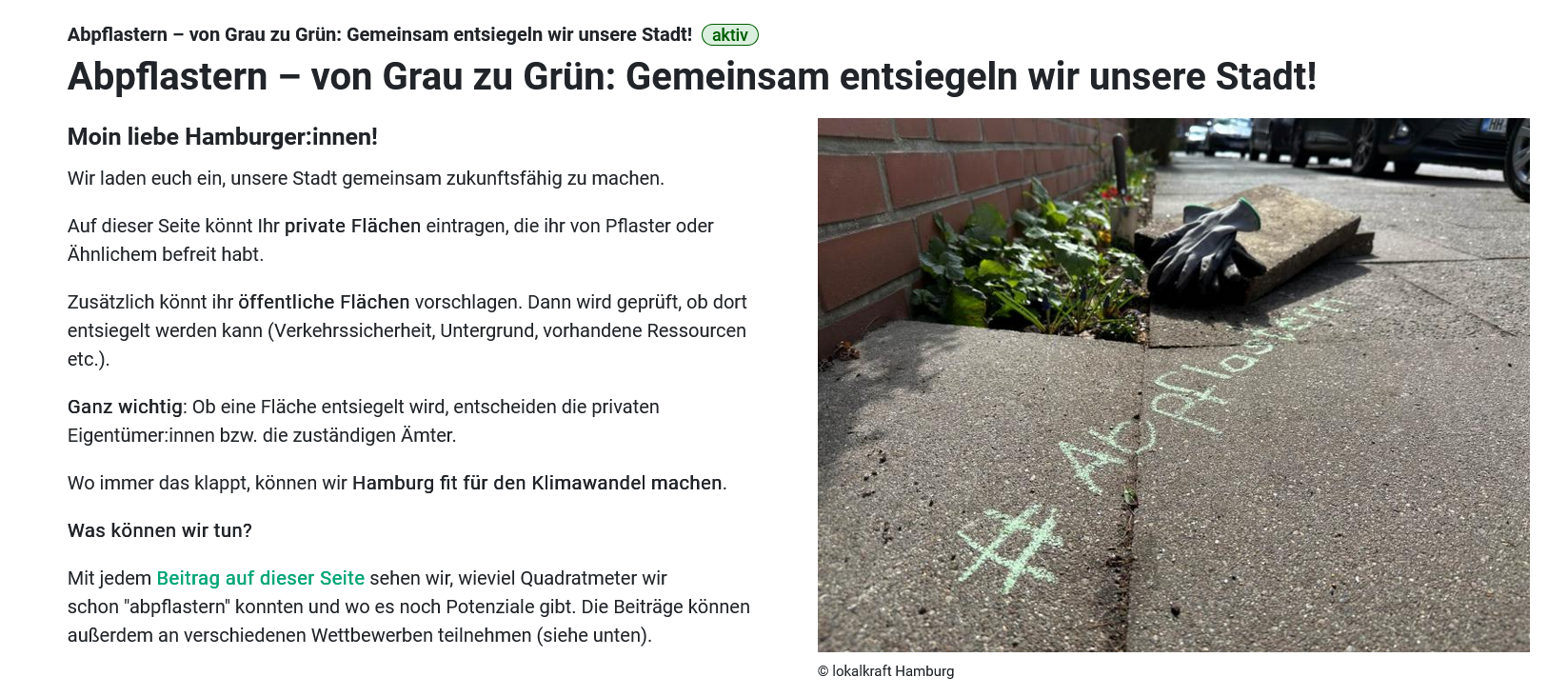 Nachbar*innen können sich über die interaktive Plattform https://abpflastern.beteilige.me/ beteiligen und abgepflasterte Flächen eintragen oder Flächen vorschlagen. Damit nehmen sie an stadtweiten Wettbewerben teil. Neben Umweltbehörde sind die HafenCity Universität, Code for Hamburg u.v.m beteiligt