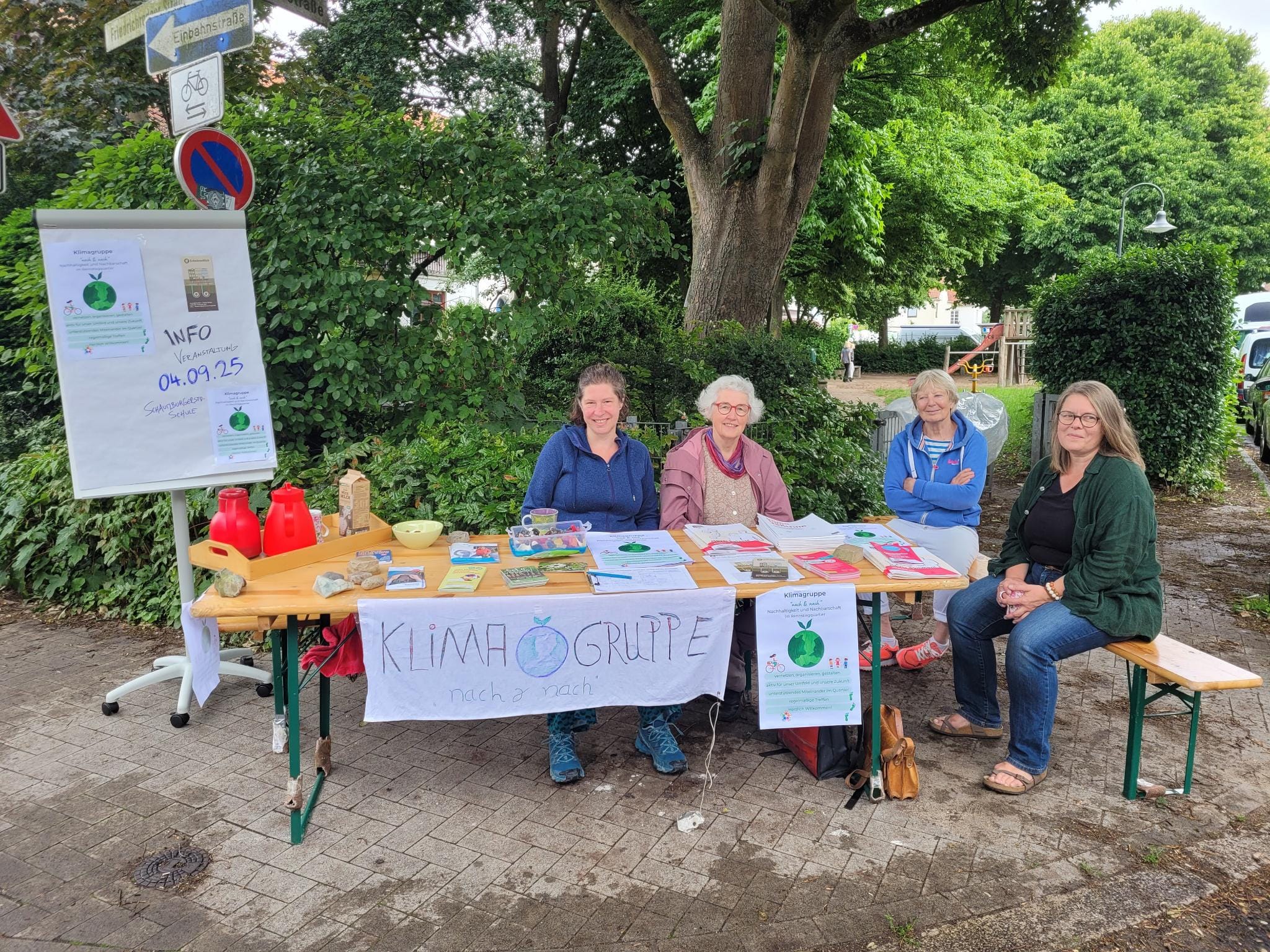 Im letzten Sommer haben wir uns gegründet und uns zunächst mit der Idee und der Orga beschäftigt. Es gibt jetzt einen Kern von ca. 10 Menschen, ein Plakat, eine Emailadresse, eine Interessiertenliste. Wir treffen uns alle 1-2 Monate an unseren Küchentischen. Vorgestellt haben wir uns auf unserem Quartiersflohmarkt mit einem Stand und organisieren gerade unsere Veranstaltung zu Erdwärme. Zwischendrin haben wir unser Nachbarquartier an deren Klimatag besucht, um uns inspirieren zu lassen.