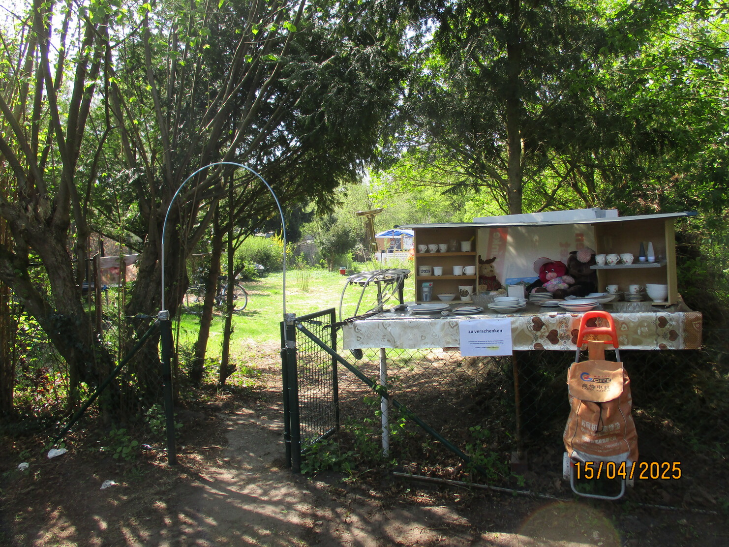 In Kombination mit dem Angebot gebrauchten, intakten, kostenlosen Geschirrs für junge Menschen oder Flüchtlinge, die ihren ersten eigenen Haushalt ausstatten möchten, entsteht im Garten eine kleine Werkstatt, in der wir gemeinsam und in gegenseitiger Unterstützung unsere Fahrräder reparieren, um sie noch länger nutzen zu können.