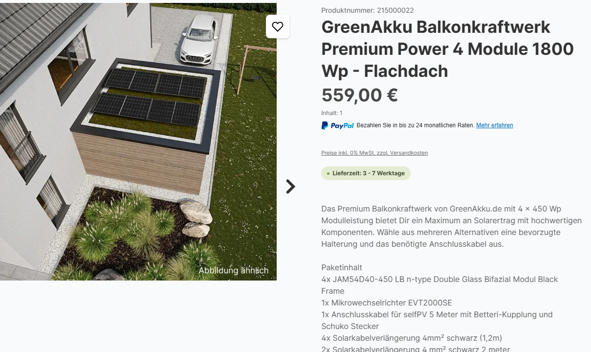 Anschaffung der Stecker-PV-Anlage „GreenAkku Premium Power 4 Module 1800 Wp - Flachdach“ (4 Module, Mikrowechselrichter, Aufständerung, Anschlusskabel), einer Smart-Steckdose und notwendiger Kleinteile. Der Einbau erfolgt in gemeinschaftlicher Eigenarbeit der NachbarInnen.