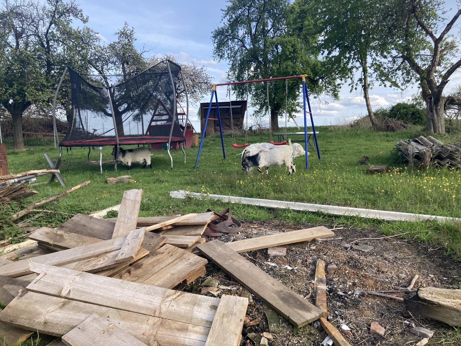 Als wir das Grundstück übernommen haben, war die Ecke für den Garten stark vermüllt und fast vollständig mit Brombeeren und Brennnesseln überwuchert. Wir haben den oberflächlichen Müll abgelesen und die Fläche durch extensive Beweidung mit Ziegen und Schafen von Brombeeren befreit.