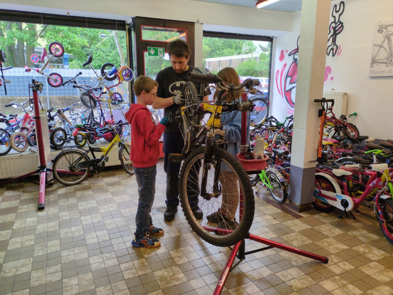 In unserer Werkstatt können Kinder und Jugendliche gemeinsam unter Anleitung ihre Fahrräder reparieren oder ein Fahrrad aus unserem Bestand aufbereiten. Die Kinder und Jugendlichen unterstützen sich gegenseitig bei der Reparatur und auch Eltern können mithelfen, die Fahrräder zu reparieren.