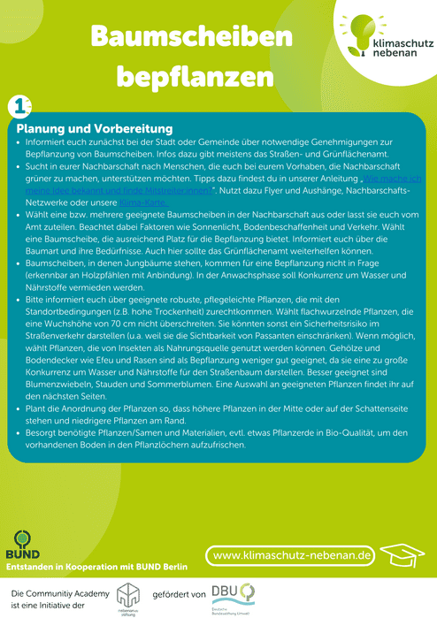 - Sucht in eurer Nachbarschaft nach Menschen, die euch bei eurem Vorhaben, die Nachbarschaft grüner zu machen, unterstützen möchten. Tipps dazu findest du in unserer Anleitung „Wie mache ich meine Idee bekannt und finde Mitstreiter:innen?”. Nutzt dazu Flyer und Aushänge, Nachbarschafts-Netzwerke oder unsere Klima-Karte.
