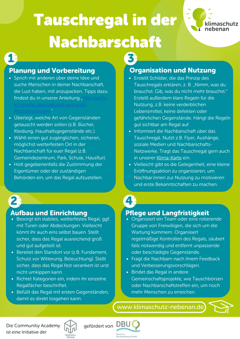 - Informiert die Nachbarschaft über das Tauschregal. Nutzt z.B. Flyer, Aushänge, soziale Medien und Nachbarschafts-Netzwerke. Tragt das Tauschregal gern auch in unserer Klima-Karte ein.
